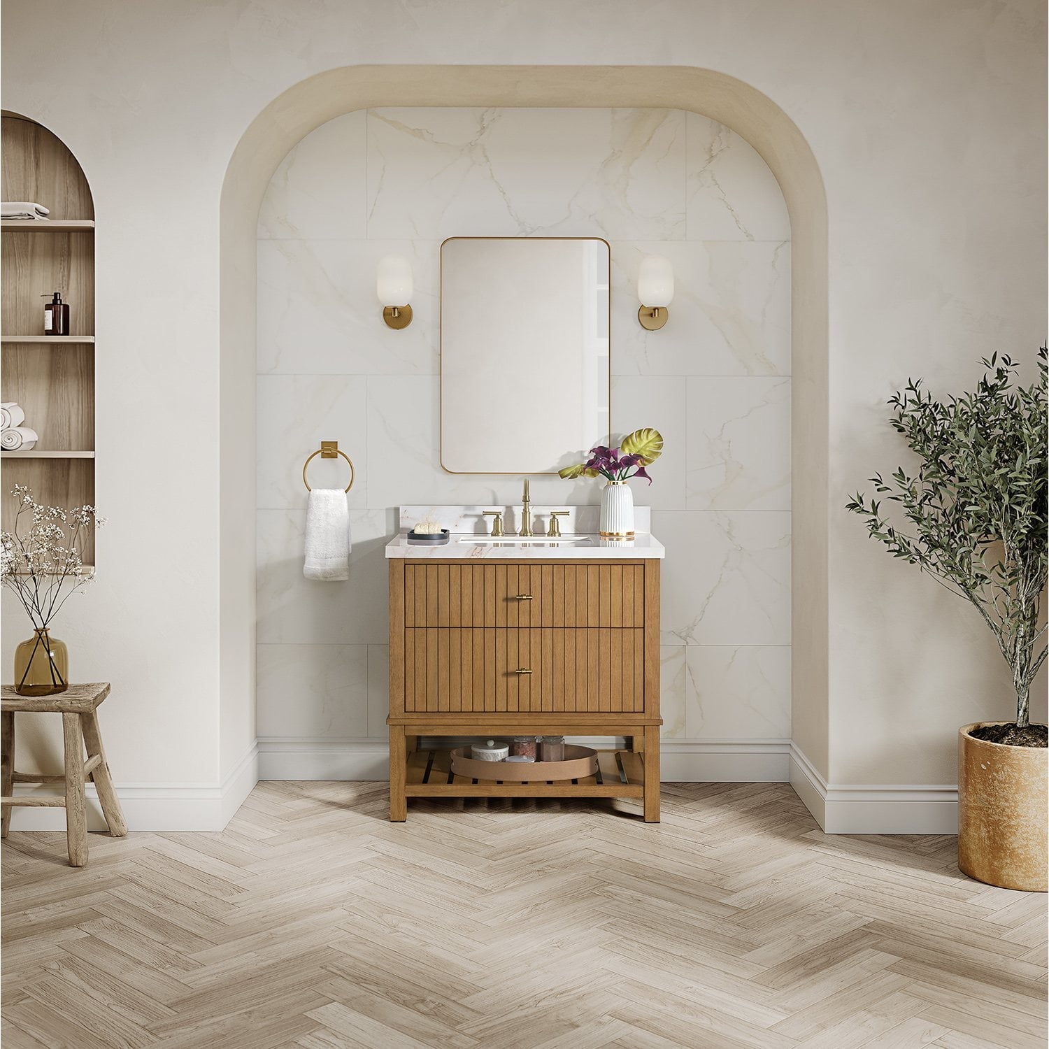 This elegant vanity combines hardwood and rubberwood solids for long-lasting durability. Featuring a premium sintered stone countertop and an integrated rectangular sink, it provides a sophisticated look for modern bathrooms. The design includes three deep storage drawers with dovetail construction and soft-close glides for smooth operation. Built-in drawer organizers keep bathroom essentials tidy, while adjustable levelers ensure stability on uneven floors. Finished with elegant gold hardware, this vanity offers both refined luxury and practical functionality for your daily routine.